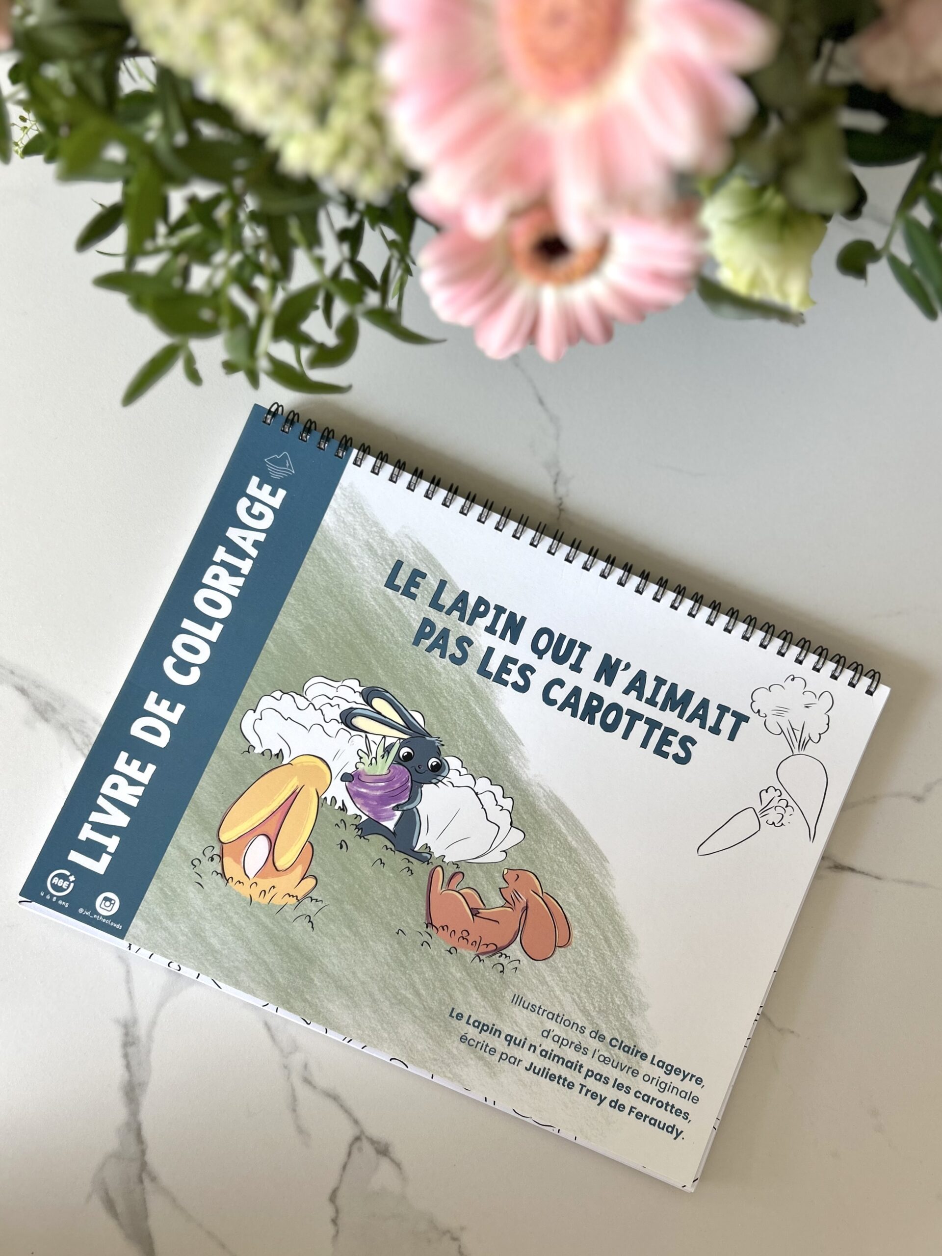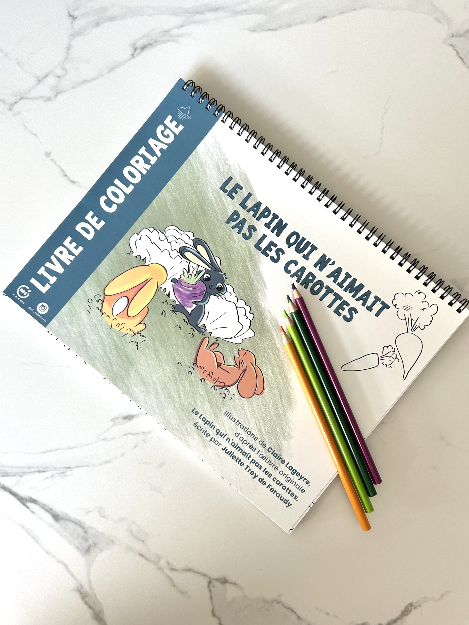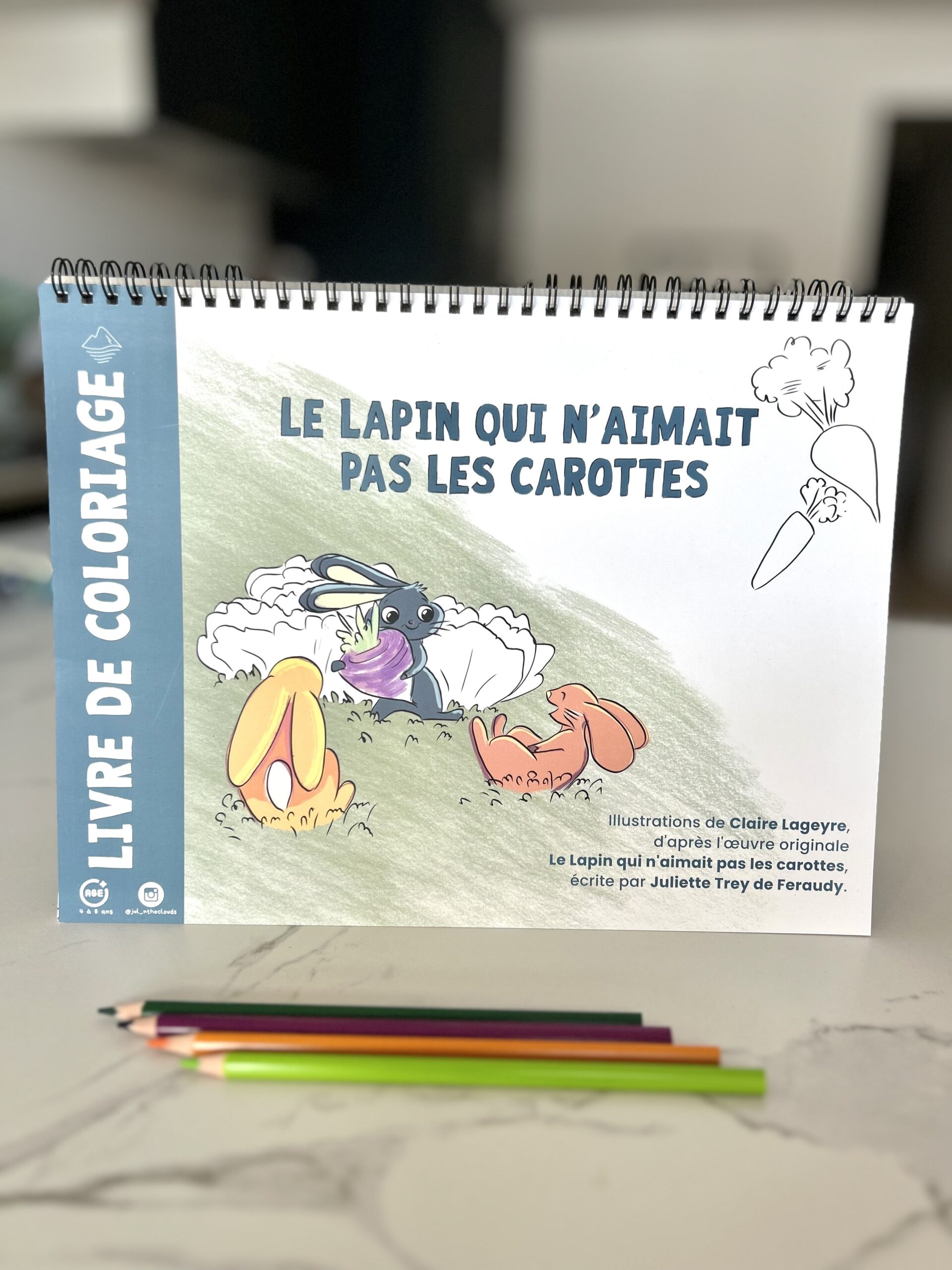 Ce livre de coloriage reprend les images de l’album jeunesse “Le lapin qui n’aimait pas les carottes“.