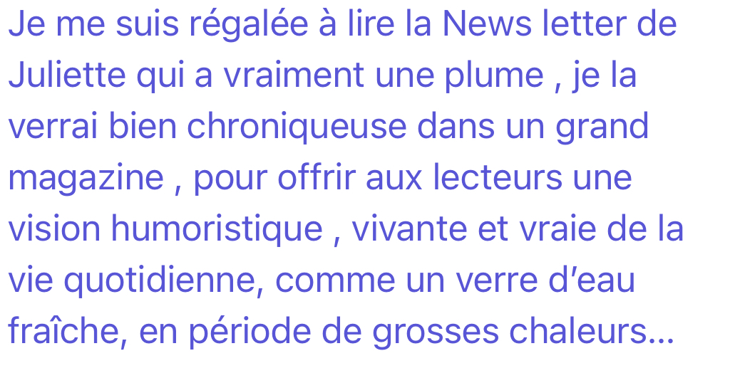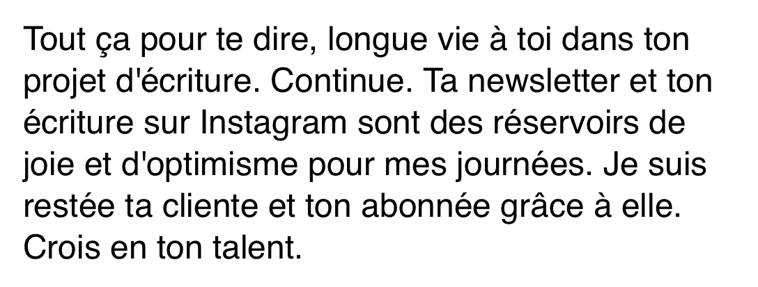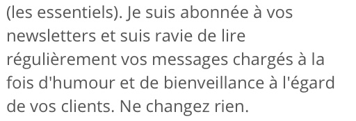 Pas besoin de préciser que j’utilise le même genre de communication dans ma newsletter d’autrice (avec une communication plus humoristique encore, car cette fois j’écris vraiment en mon nom), et que ça fonctionne toujours aussi bien ! Voici quelques témoignages de lecteurs et lectrices au fil du temps :